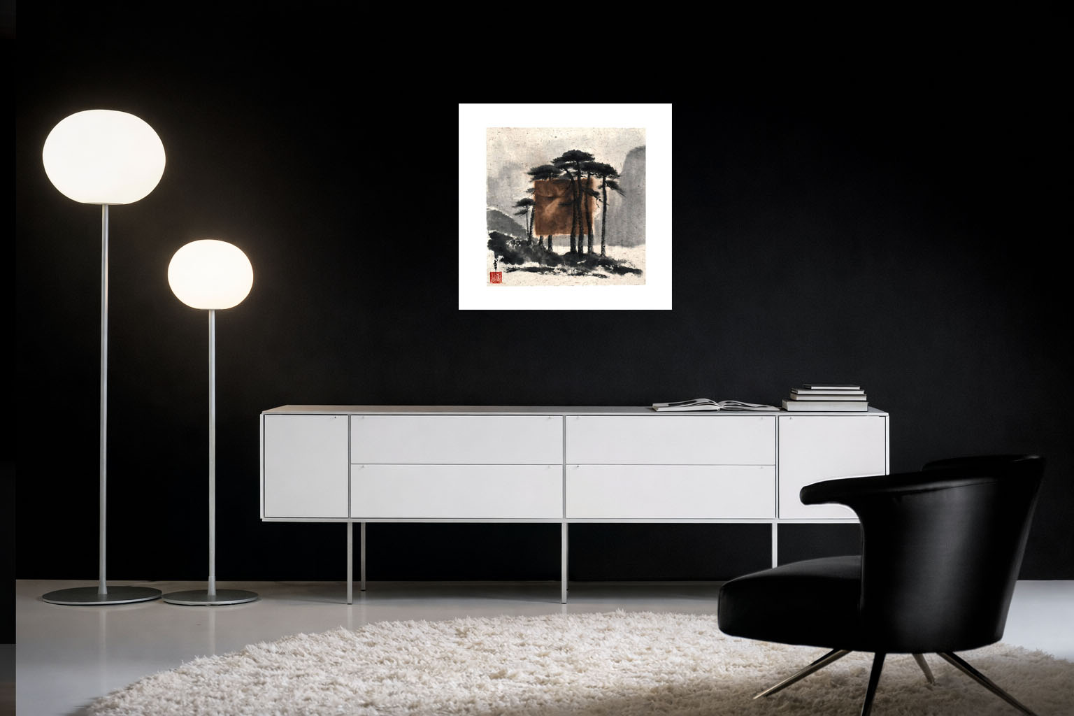 Une forêt d’encre se dresse, calme et verticale, dans une brume de montagnes.
